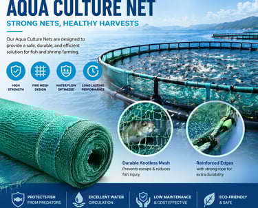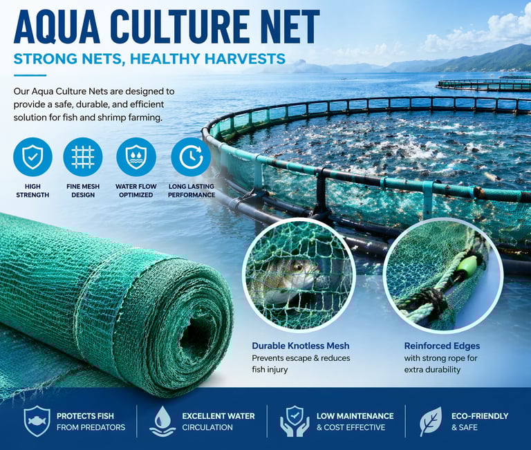 Aqua Culture Nets are specially designed for fish and shrimp farming, ensuring a safe and controlled aquatic environment. Made from high-strength, UV-stabilized materials, these nets offer excellent durability and resistance against harsh water conditions. Their fine mesh structure prevents fish escape while allowing proper water flow and oxygen circulation. Ideal for ponds, cages, and coastal farming, they help improve productivity and maintain healthy aquatic life.