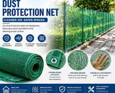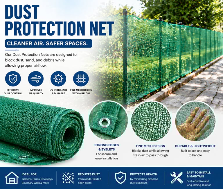 Dust Protection Nets are designed to control and reduce dust spread in various environments, ensuring cleaner and safer surroundings. Made from high-quality, UV-stabilized materials, these nets act as an effective barrier while allowing proper airflow. They help improve visibility, protect nearby areas, and maintain a healthier environment. Durable and weather-resistant, they are ideal for long-term use in demanding conditions.