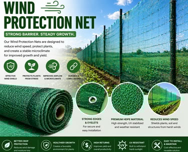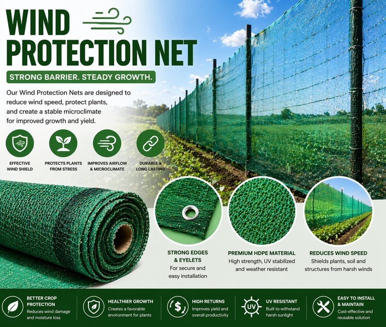 Wind Protection Nets are designed to reduce wind intensity and create a stable environment for crops and outdoor areas. Made from high-quality, UV-stabilized materials, they act as an effective barrier against strong winds while allowing controlled airflow. These nets help prevent soil erosion, crop damage, and moisture loss, ensuring better growth and productivity. Durable and easy to install, they are ideal for agricultural and commercial use.