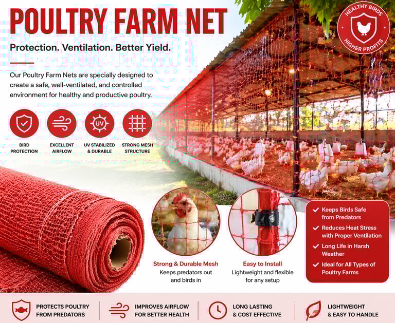 Poultry Farm Nets are designed to create a safe, hygienic, and well-ventilated environment for poultry farming. Made from high-quality, UV-stabilized materials, these nets provide strong protection against predators while allowing proper airflow and light penetration. They help maintain ideal conditions for healthy bird growth and improved productivity. Durable and easy to install, they are suitable for all types of poultry setups.