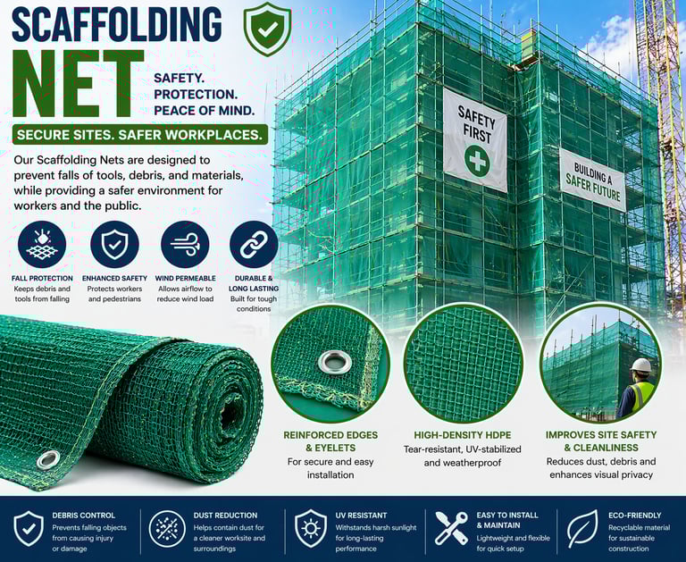 Scaffolding Nets are designed to enhance safety and protection at construction and industrial sites. Made from high-quality, UV-stabilized materials, these nets help prevent debris from falling while reducing dust spread. They also provide a protective barrier for workers and surroundings, ensuring a safer working environment. Durable and weather-resistant, they are ideal for long-term use in demanding conditions.