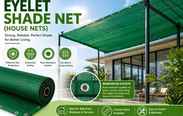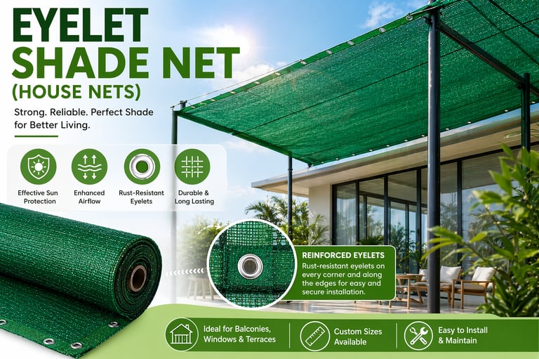 Eyelet Shade Nets are designed for easy installation and secure fitting, thanks to their strong, rust-resistant eyelets. They provide effective sun protection while allowing proper airflow, creating a comfortable and shaded environment. Made from durable, UV-stabilized materials, they ensure long-lasting performance. Ideal for balconies, terraces, and outdoor spaces, they combine functionality with a clean, modern look.